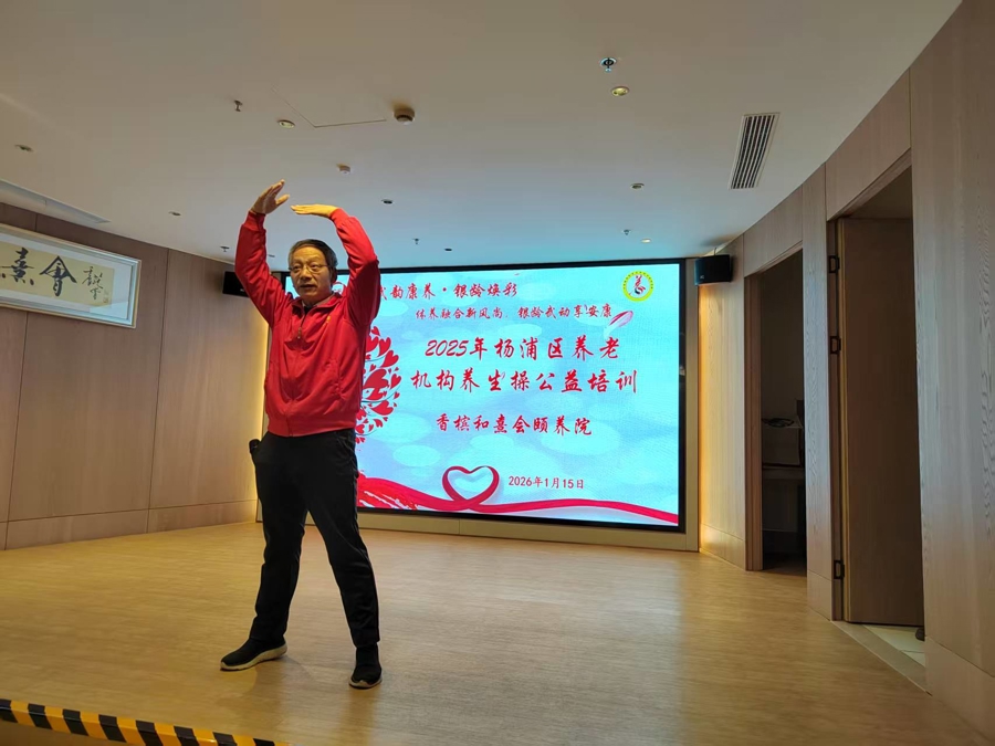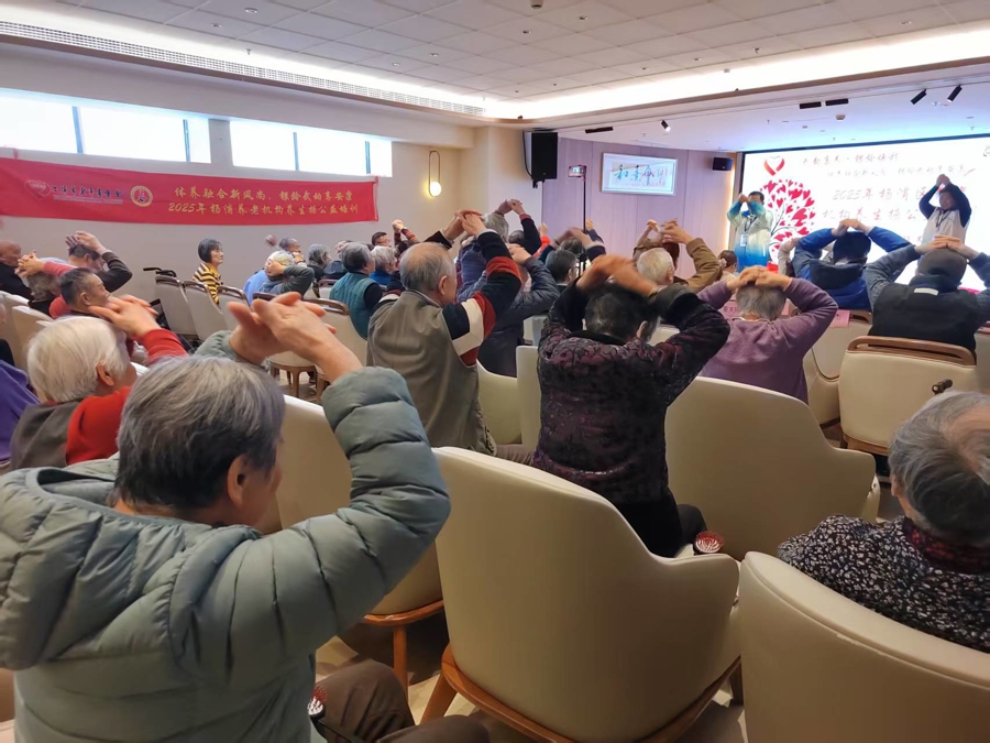 1月15日下午,在杨浦香槟和熹会颐养院的活动室里,20多位白发苍苍的老人在杨浦滨江太极队志愿者康阿珍和伙伴的带领下纷纷举起双手,轻轻拍打在自己的臂膀和身躯穴位上。这是滨江太极队志愿者们走进的第24家养老机构顺配宝,今后几个月,排在他们志愿服务目录上的还有20多家养老机构。